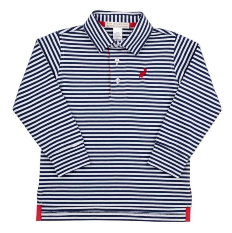 Prim and Proper Polo LS Nantucket Navy Stripe Richmond Red