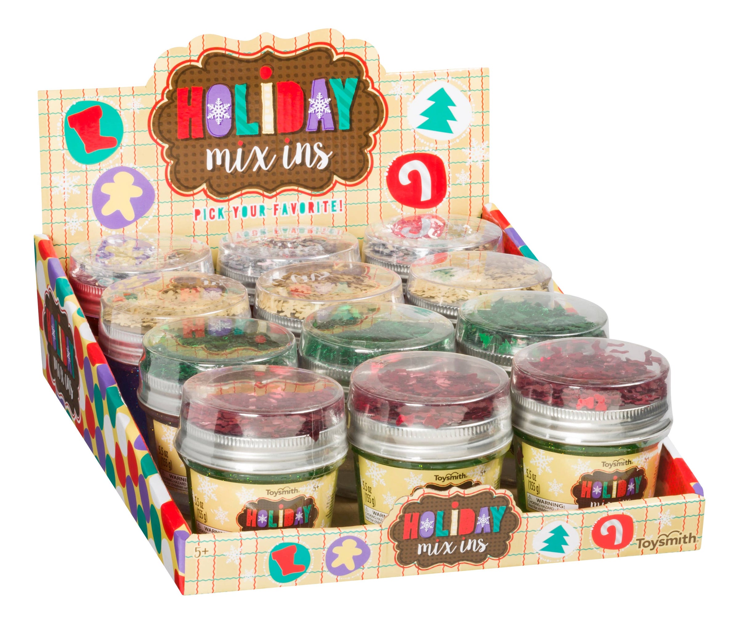 Festive slime fun! Add a festive twist to your store slime selection with this assortment of holiday slime mix ins, featuring a variety of clear glitter slime and holiday inspired confetti mix ins. You will receive a display of twelve 5.5 oz. containers of slime and holiday confetti in assorted colors and styles. Recommended for age 5 years and up.